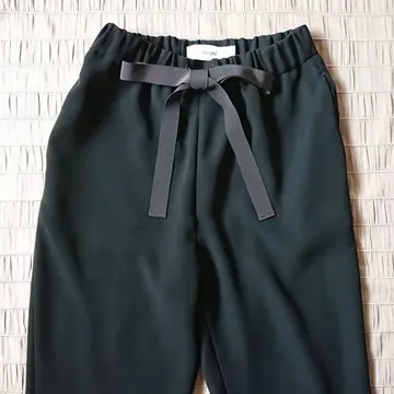 ボトムはsaquiの漆黒テーパードリボンパンツ。とろみがあり上質できれいめなのにウエストがゴム。