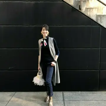 Deuxieme Classeのジレ。en recreのタイとFuang Faの羽根バッグもポイントです。