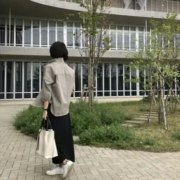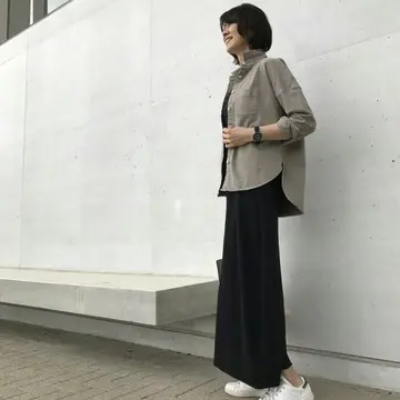 サンドは色を選ばず相性がよく、存在感のあるワイドパンツも派手にならず落ち着きます。