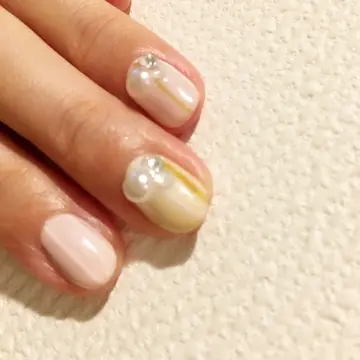 新年を迎えるネイルは、大きめのパールをメインに、パステルのイエローとピンクネイルにしました。
