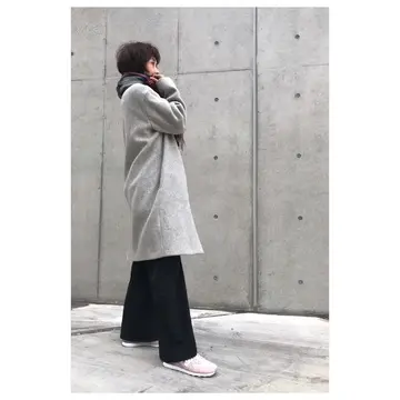 重く見えがちなロングコートもピンクのニューバランスで軽く。 何よりフットワークが軽くなります。