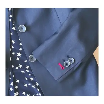 ボタンホールやブートニエール、手縫いの袖口ステッチにはマゼンタピンクの糸を使用。チラリと見えるピンク色は女心を擽ぐります(*^^*)