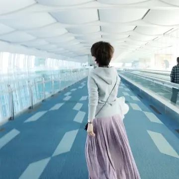 左 旅行時に、ドレステリアのパーカ&スニーカーのコーデ