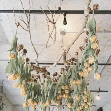 アトリエの天井には球根付きチューリップが300本が吊り下がり