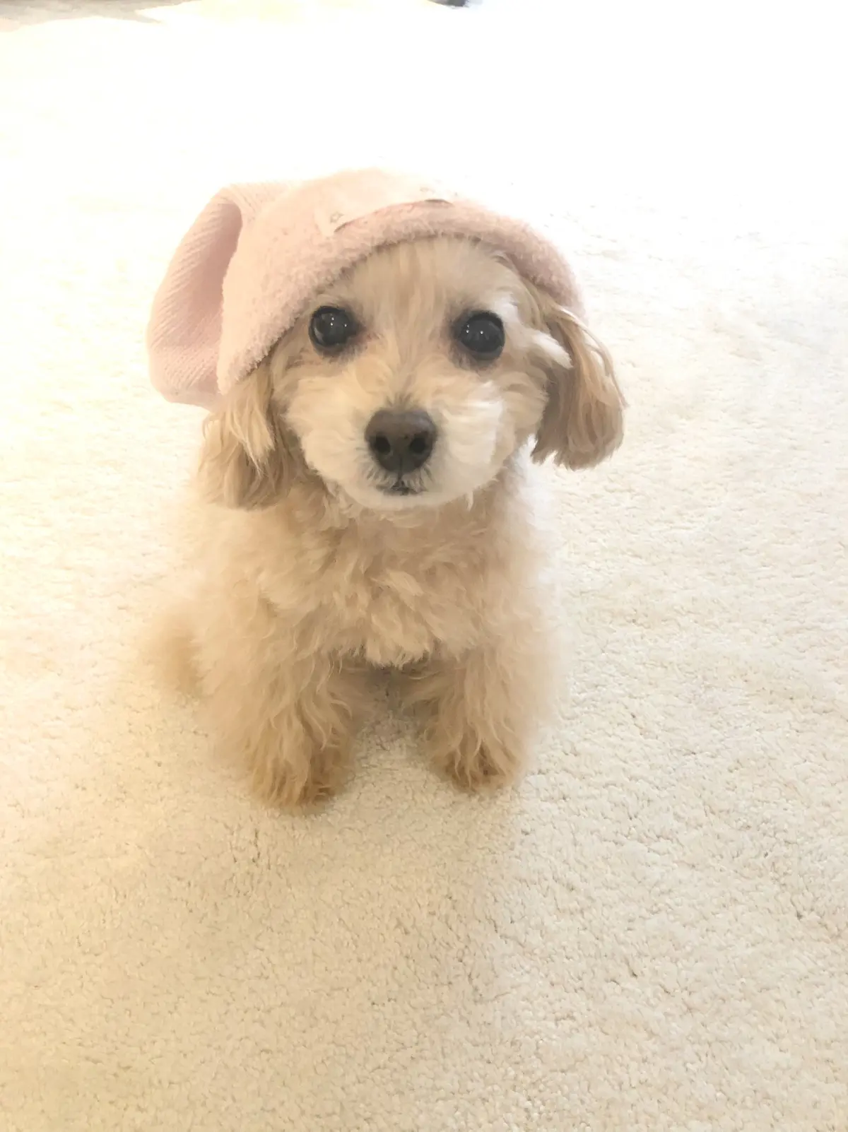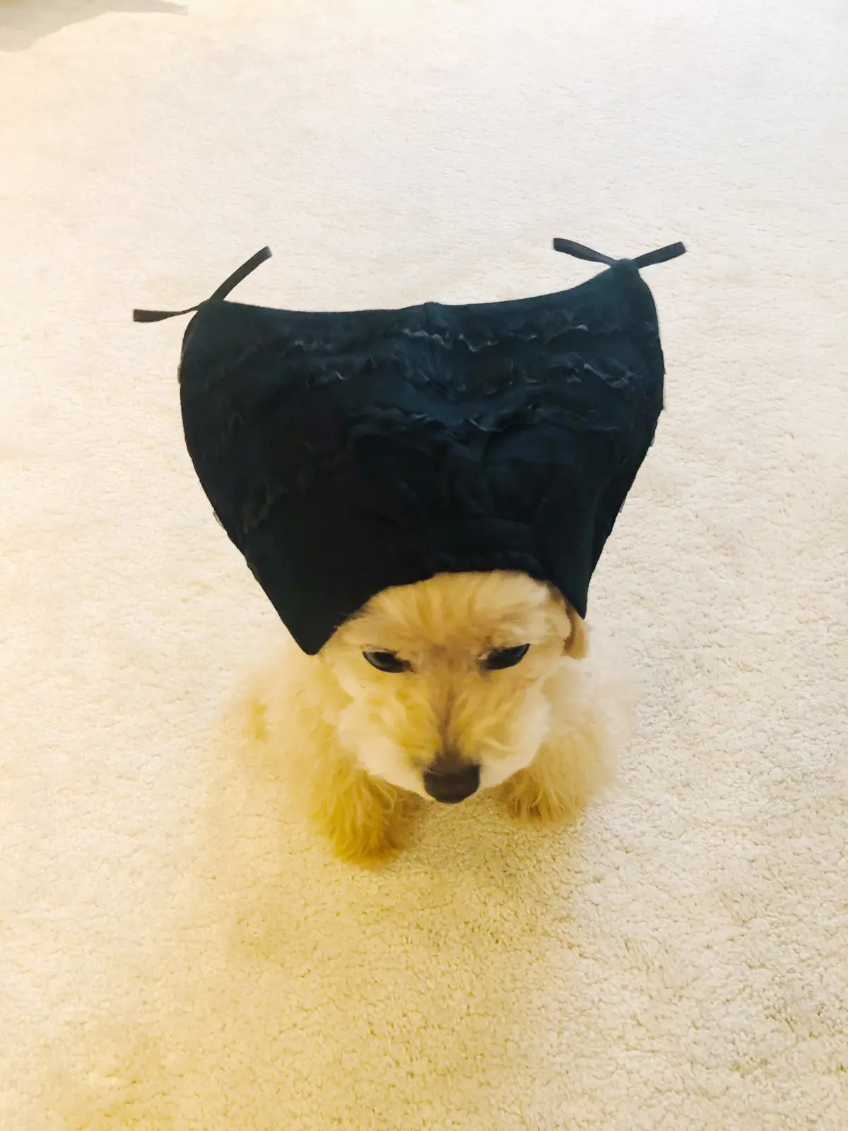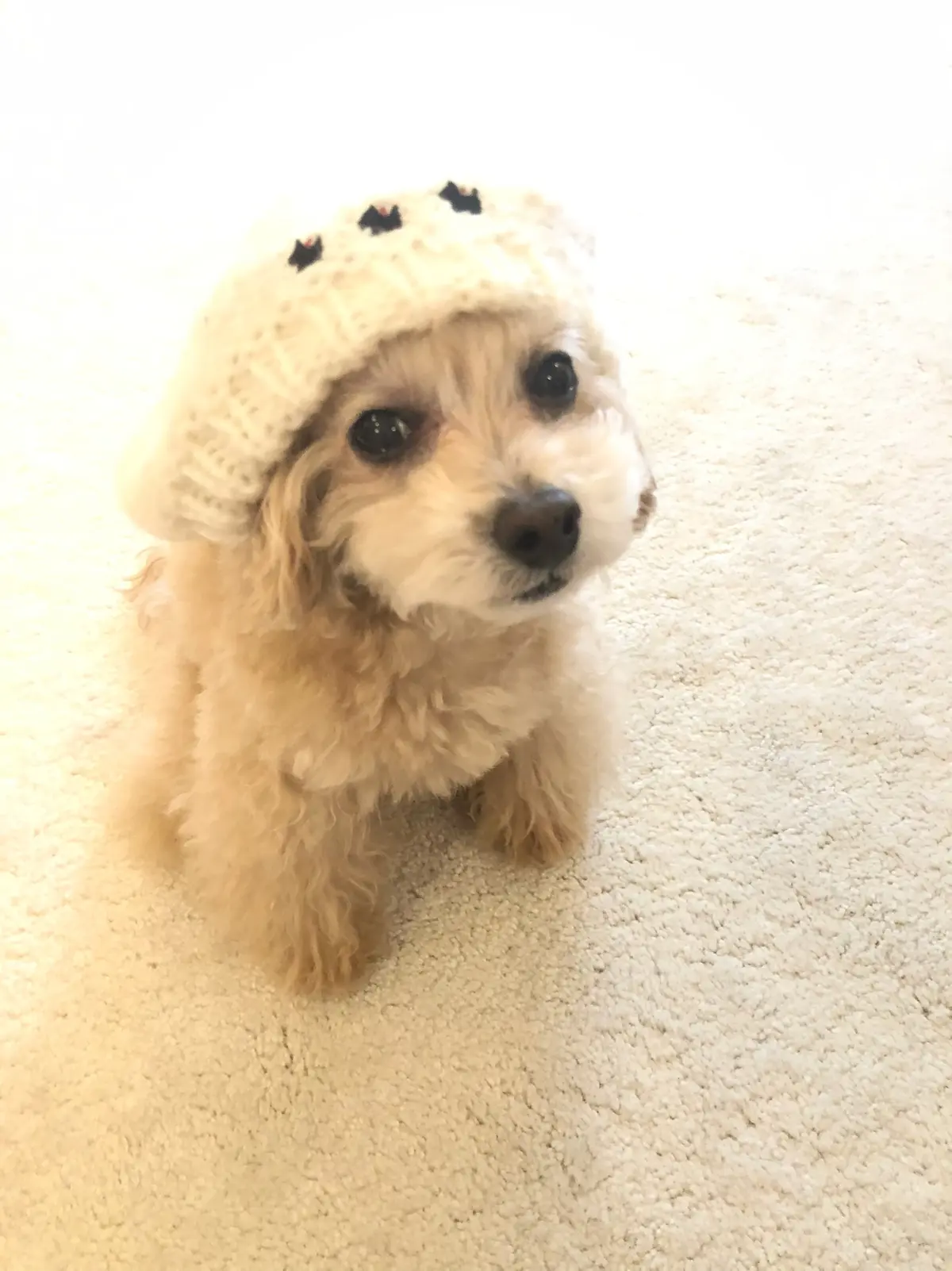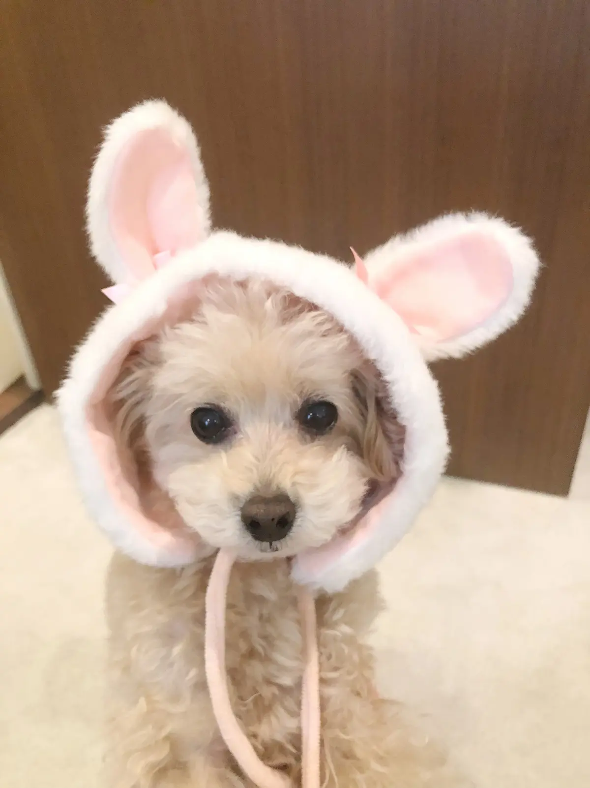 娘がベビーの頃の帽子が出てきたのでミルクに被ってもらいジャッジ…こんな時間も楽しい