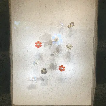 漆喰の壁には花をモチーフにしたジュエリーの数々が展示されています