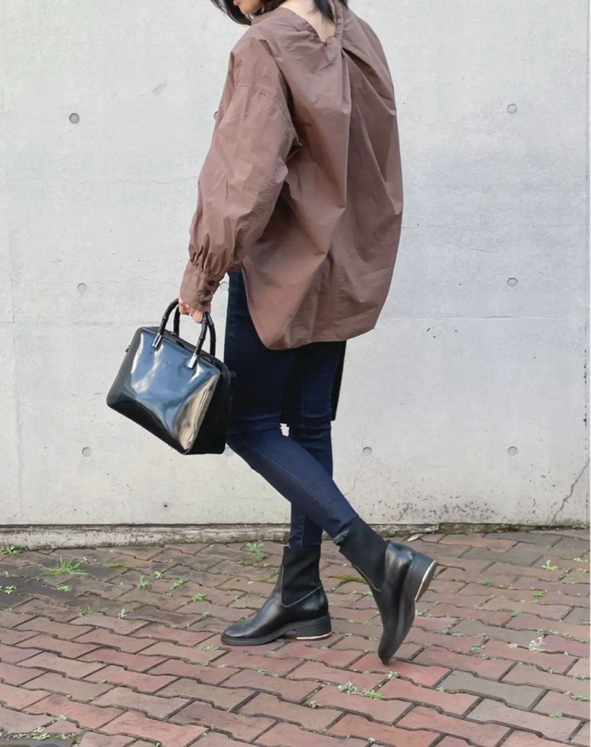 濃いブラウンなので甘すぎず、いろんなボトムスに合わせられそうなので、気に入っています。