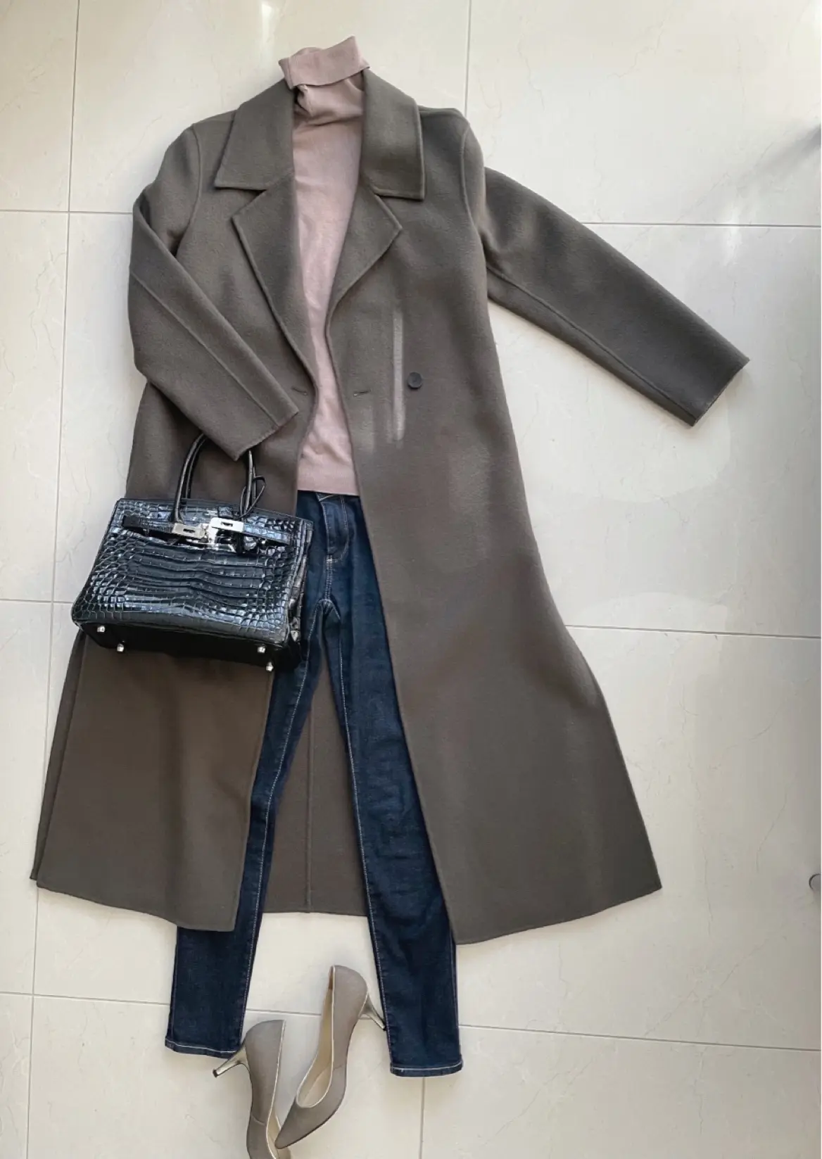 ロングコートにデニム。