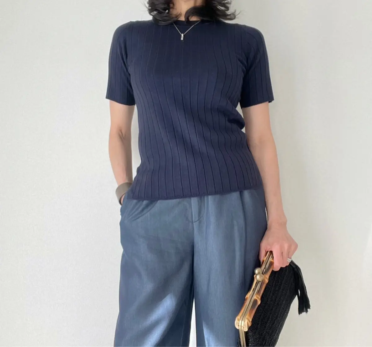 まずはネイビーのワイドパンツに合わせて、スッキリワントーンコーデ。