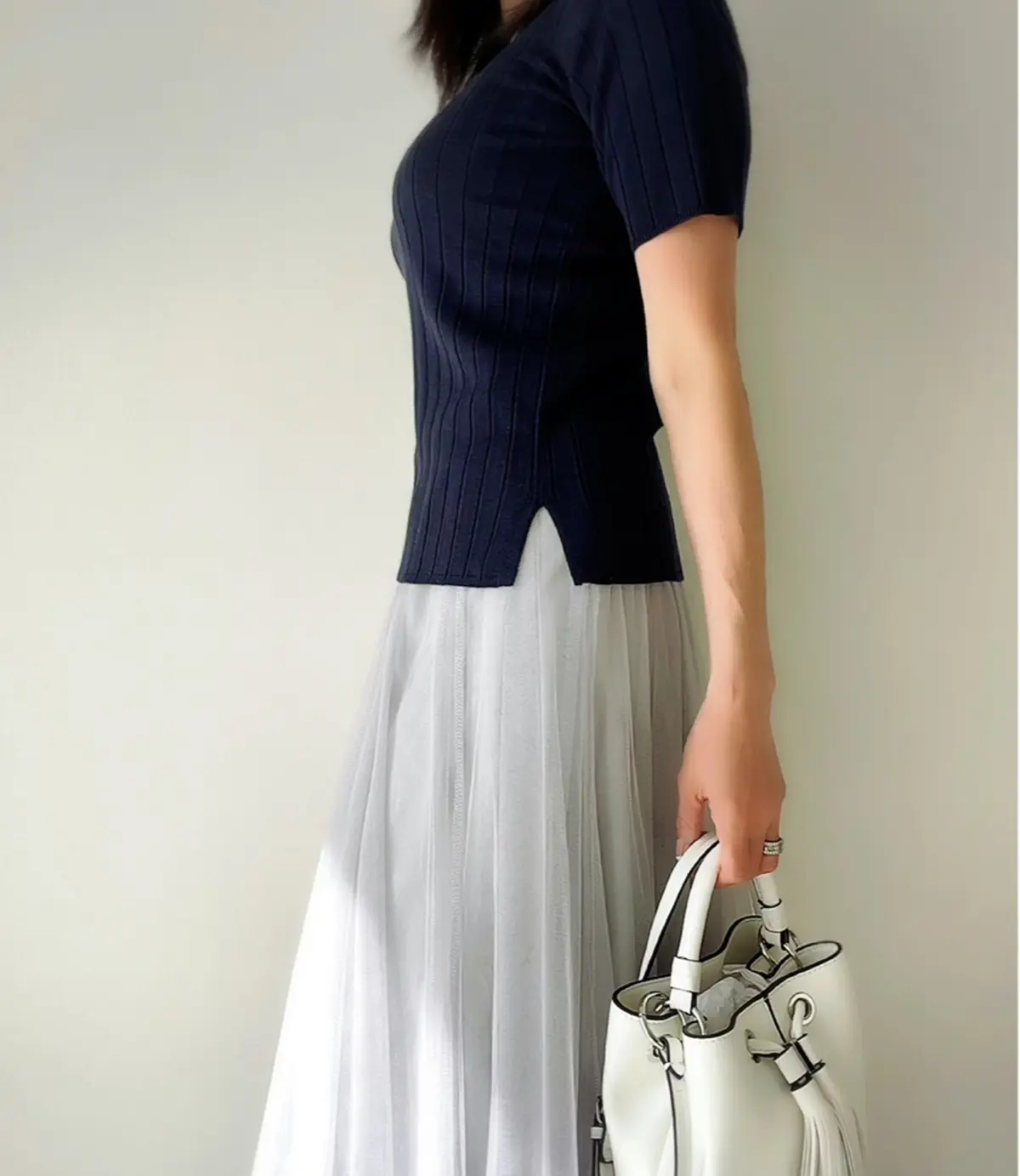 展示会で見つけたシルクニットをワイドパンツ、シフォンスカートに合わせて。