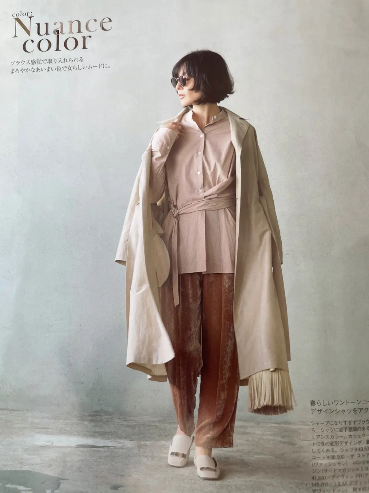 バンドカラーシャツで、自分らしい春コーデを満喫してます。