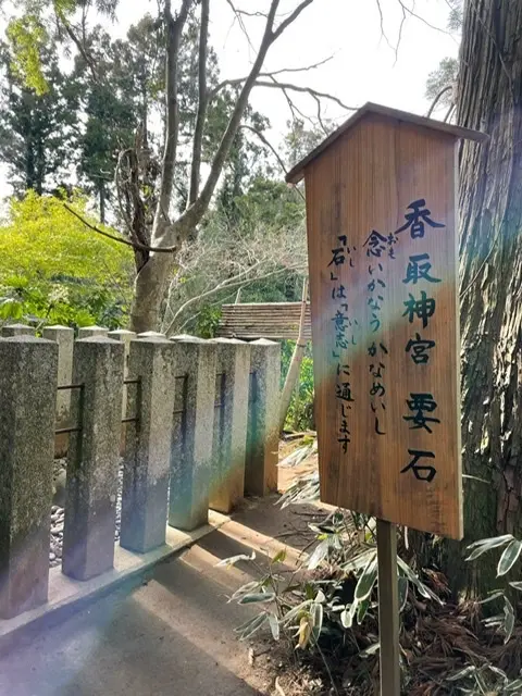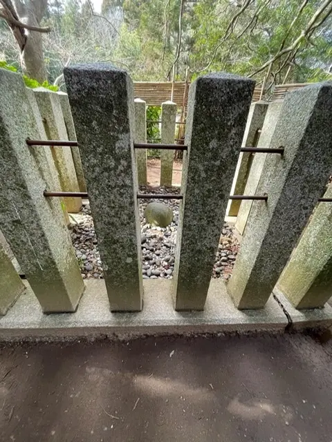 パワースポットと言われている拝殿隣の三本杉、旧参道を歩いた先にある要石。