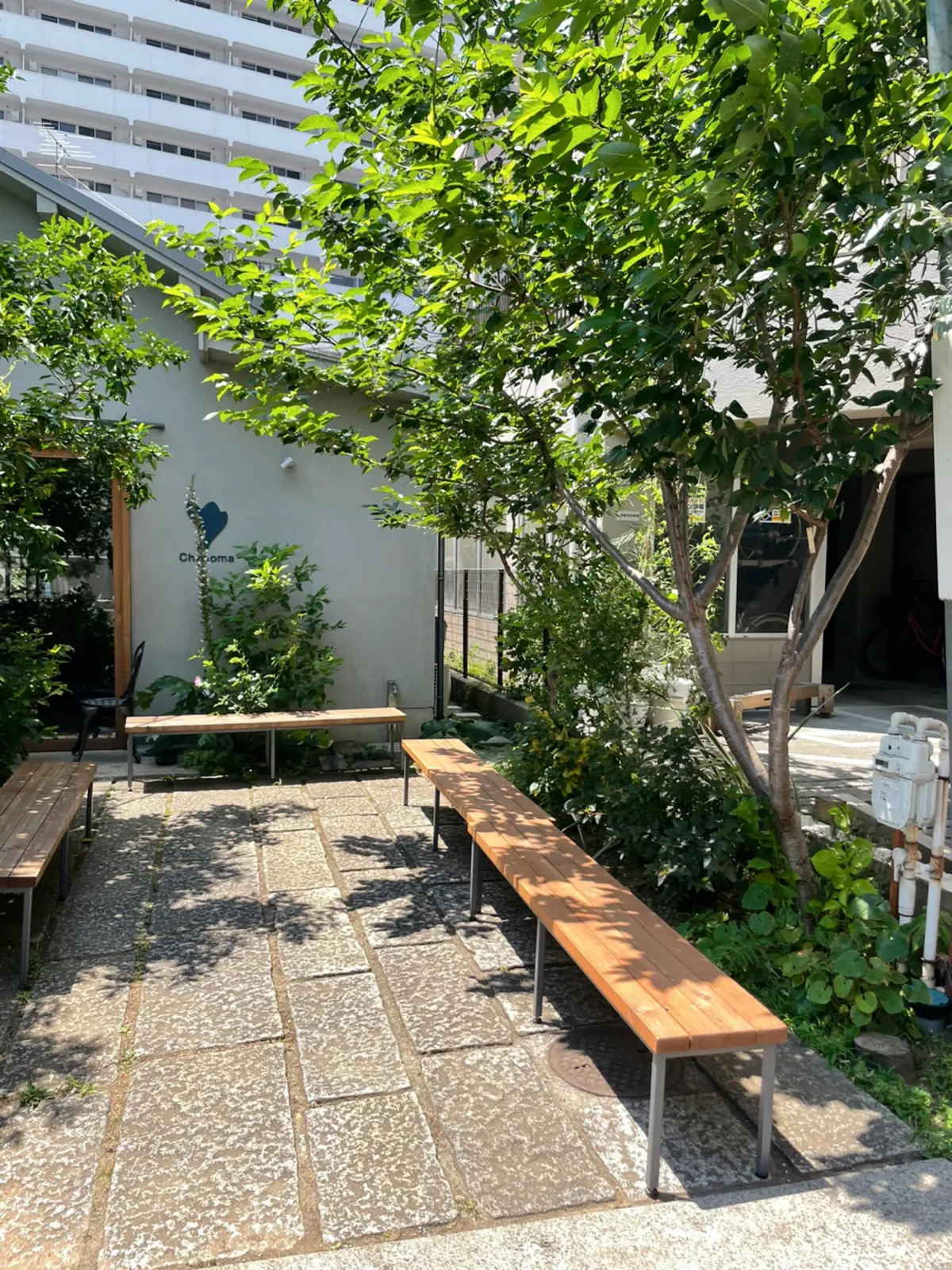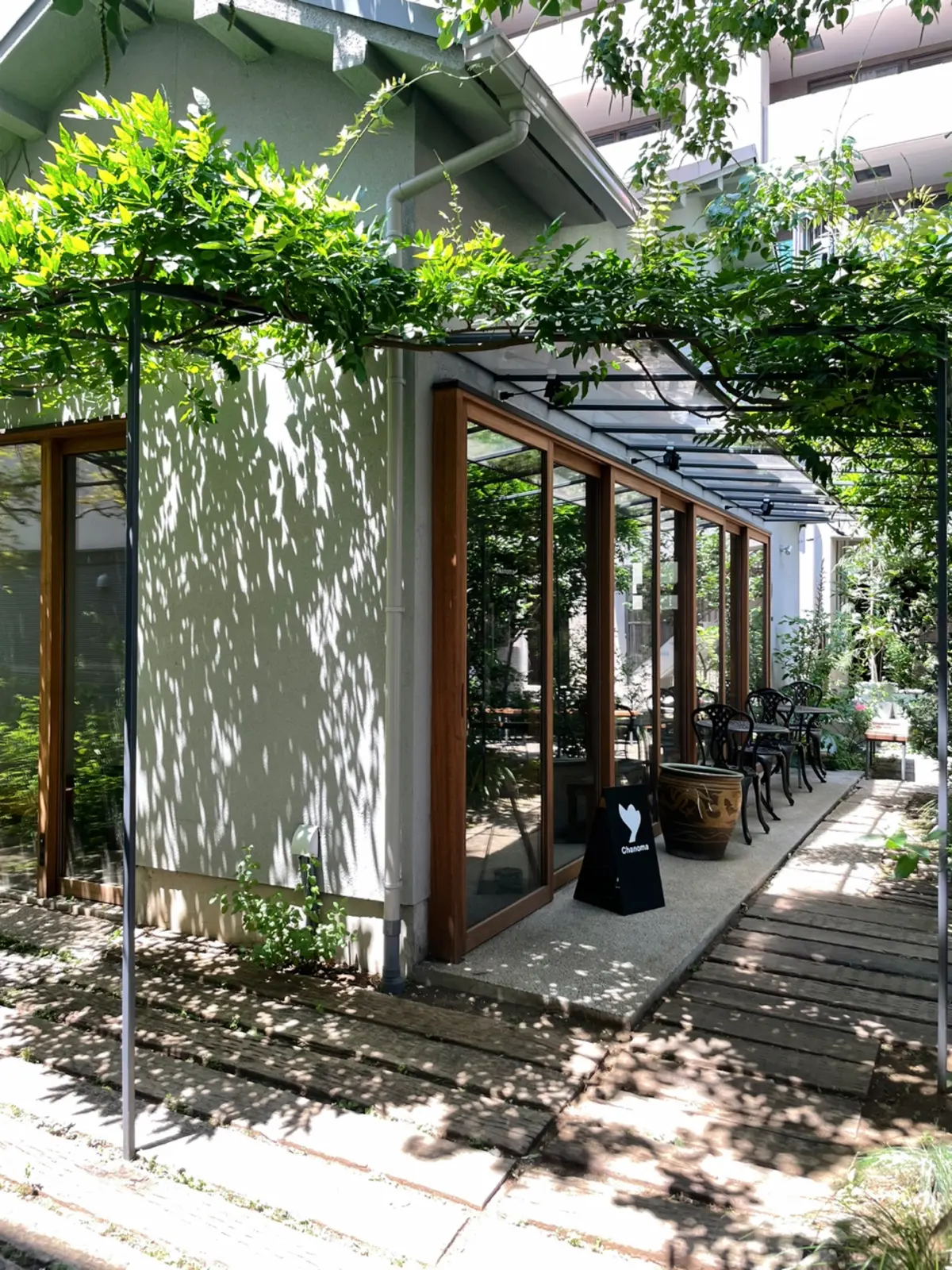 大通りを少し入った場所にあるカフェ、chanoma。緑に囲まれた外観は、都会の真ん中にある事を忘れてしまうほど落ち着いた雰囲気です。