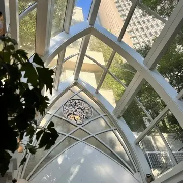 ガラスで覆われた屋根からは空や緑が見えて開放的。