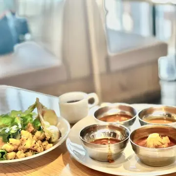 ランチビュッフェがあり、数種類のカレーや小松菜ナンとクリームのデザートがお気に入り❤️