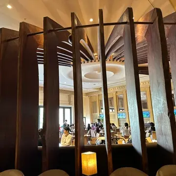 木のぬくもりが心地よく鳥たちが遊びに来るような開放感あふれるスラッシュカフェは、約1万坪の庭園を眺めることができるテラス席で爽やかな風を感じながらのランチで、ゆっくりとした時間を楽しみました。