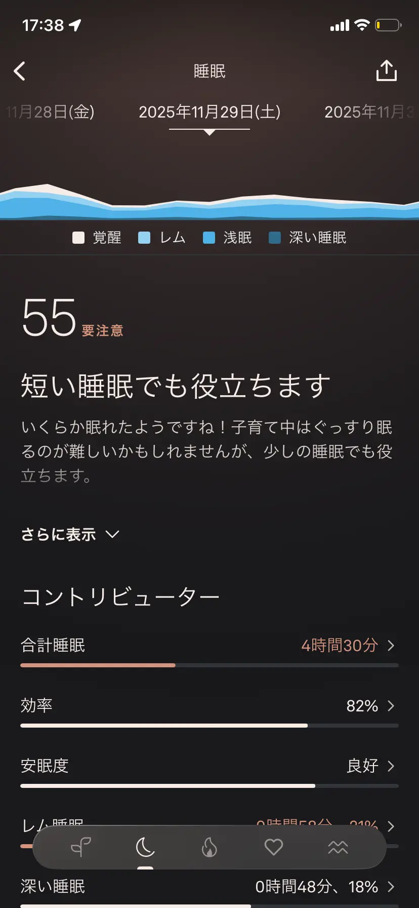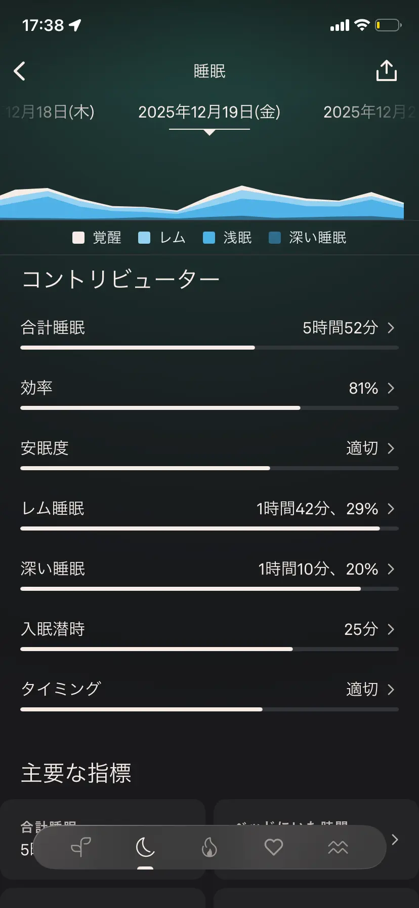 睡眠中のあれこれや、起きている間の心拍数、その日歩いた歩数などを記録・解析してくれて、
