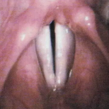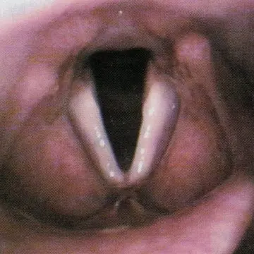 白っぽい部分が声帯。呼吸をしている時、声帯はV字に開いている。