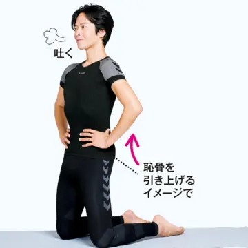 口から息を吐きながら肋骨をすぼませていきます。肋骨の前側がふくらまないように、気をつけて行って