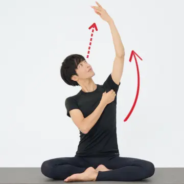股関節から脚を外旋させたまま、右膝だけ真上に伸ばします。このとき、膝と足の甲が外側を向いていれば、脚が外旋できているサイン。