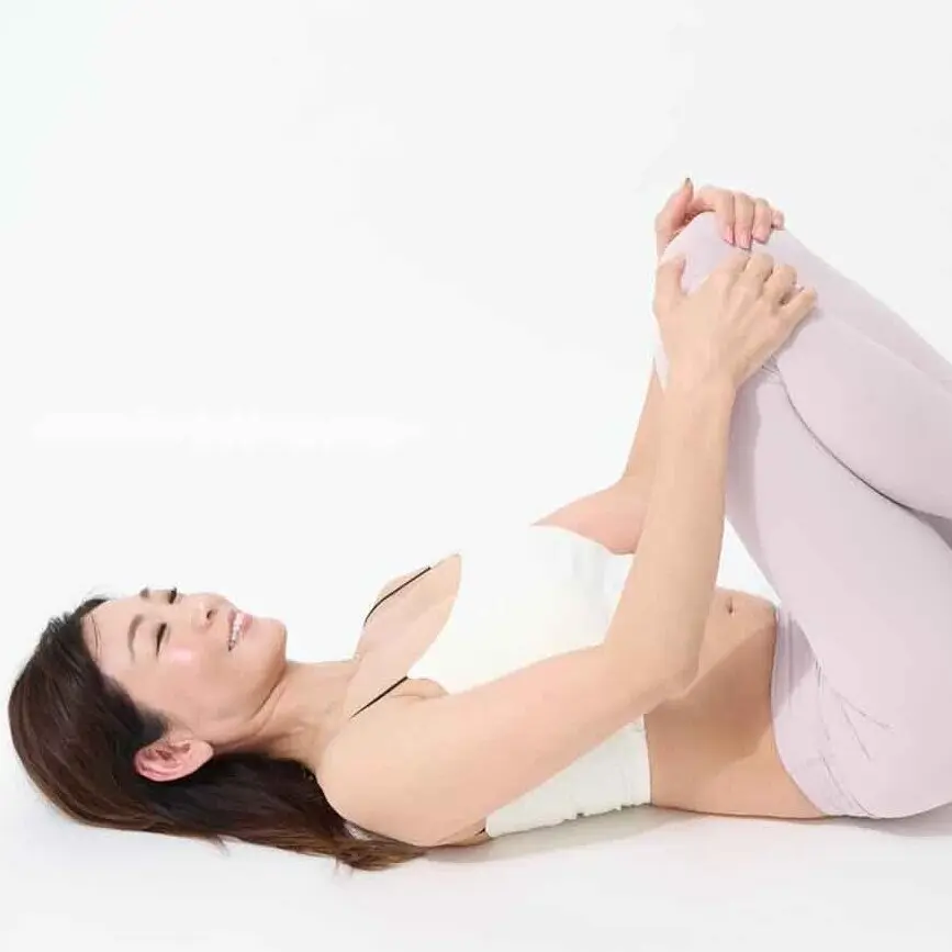 ③両手で左脚をつかんで、息を吸って、吐きながら手前に引き寄せて3〜5呼吸。このとき、手と脚で押し合うようにしましょう。次に左右を入れ替えて同様に。左右各1〜2回。