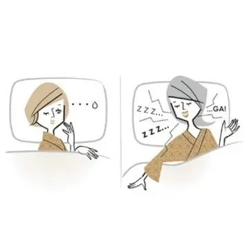 幸福ホルモンでもあるエストロゲンの減少で不安やイライラを感じやすくなる。そのせいでレム睡眠が増え、寝言も増加。また呼吸を促進する女性ホルモンが減ることに加え、筋力低下で舌が落ち、気道が狭くなり、いびきに。