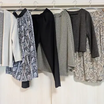 作品の一部。スカートや、タックパンツ。コーディガンや、フード付きのシャツなど…