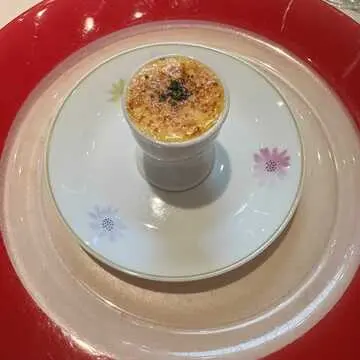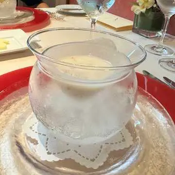 桃の冷製ポタージュと蟹身を浮かべたコンソメのジュレ