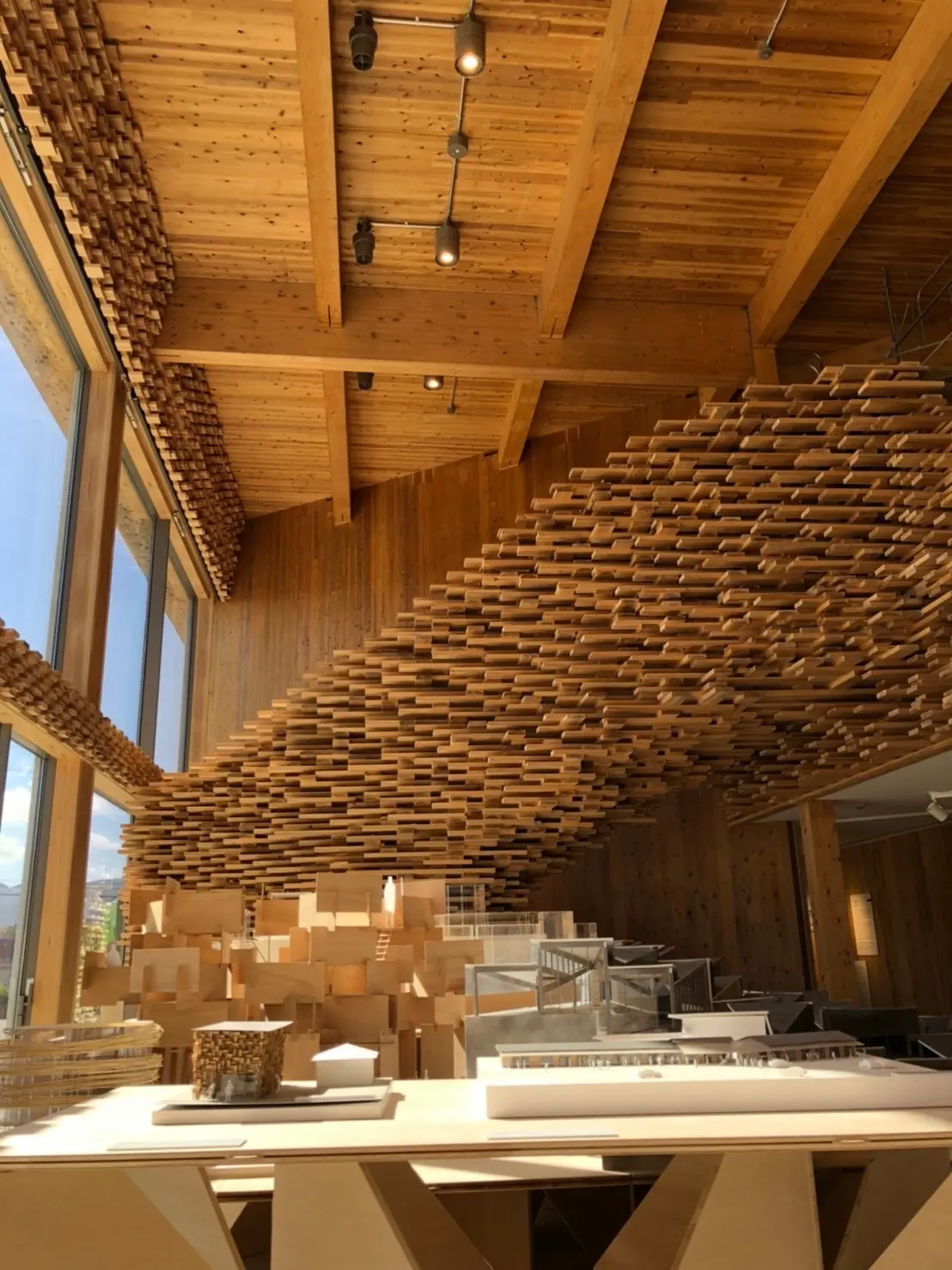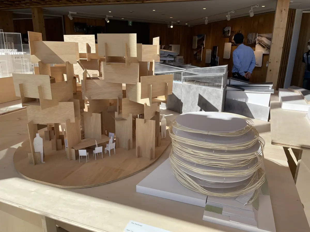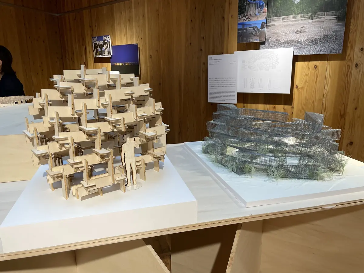 展示場内の様子です。受付で遠慮がちに撮影許可を聞いたところ、「あ~、いっぱい撮ってSNSで流してください~」と嬉しいお言葉をいただきました。展示場内のスタッフの方々は、皆さん親切で、明るくて、詳しく説明をしてくださいました。友人はスタッフに勧められて、建築家の椅子に色々座っていました(笑)私も遠慮なく、たくさん撮影させていただきました!皆様に展示場内を見ていただけてうれしいです。隈 研吾氏ワールド満載の展示会場でした。