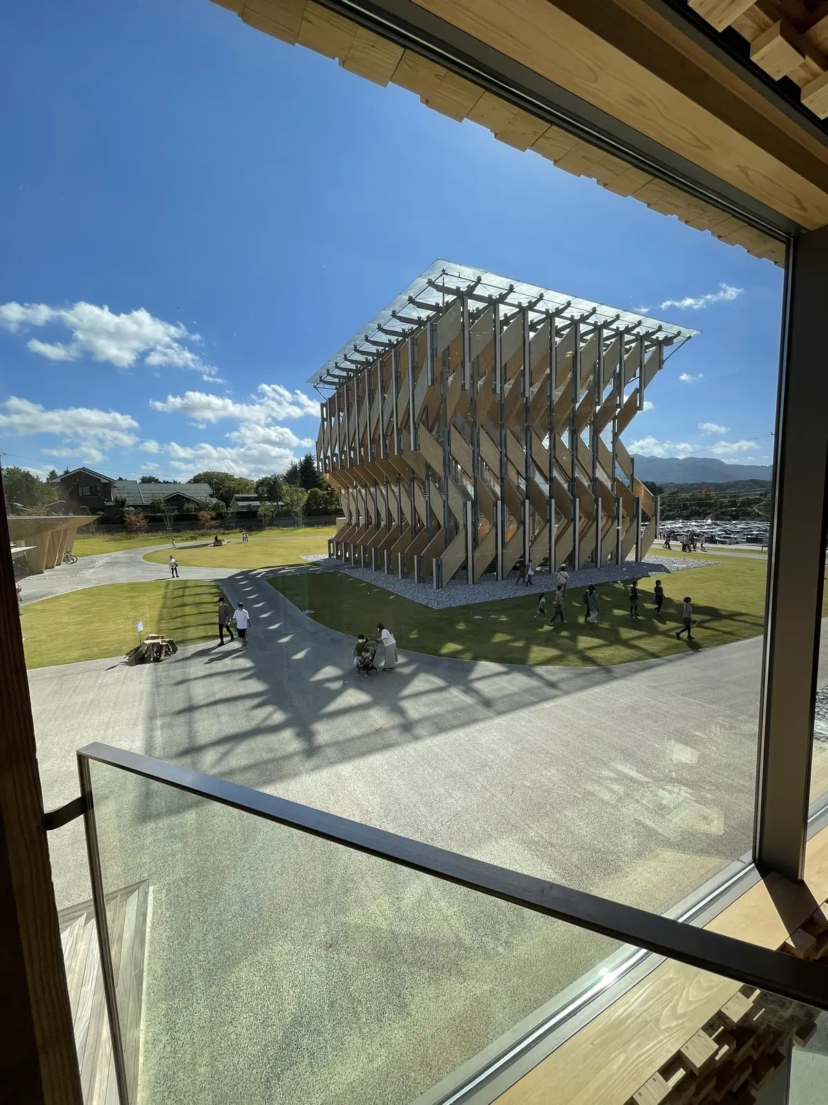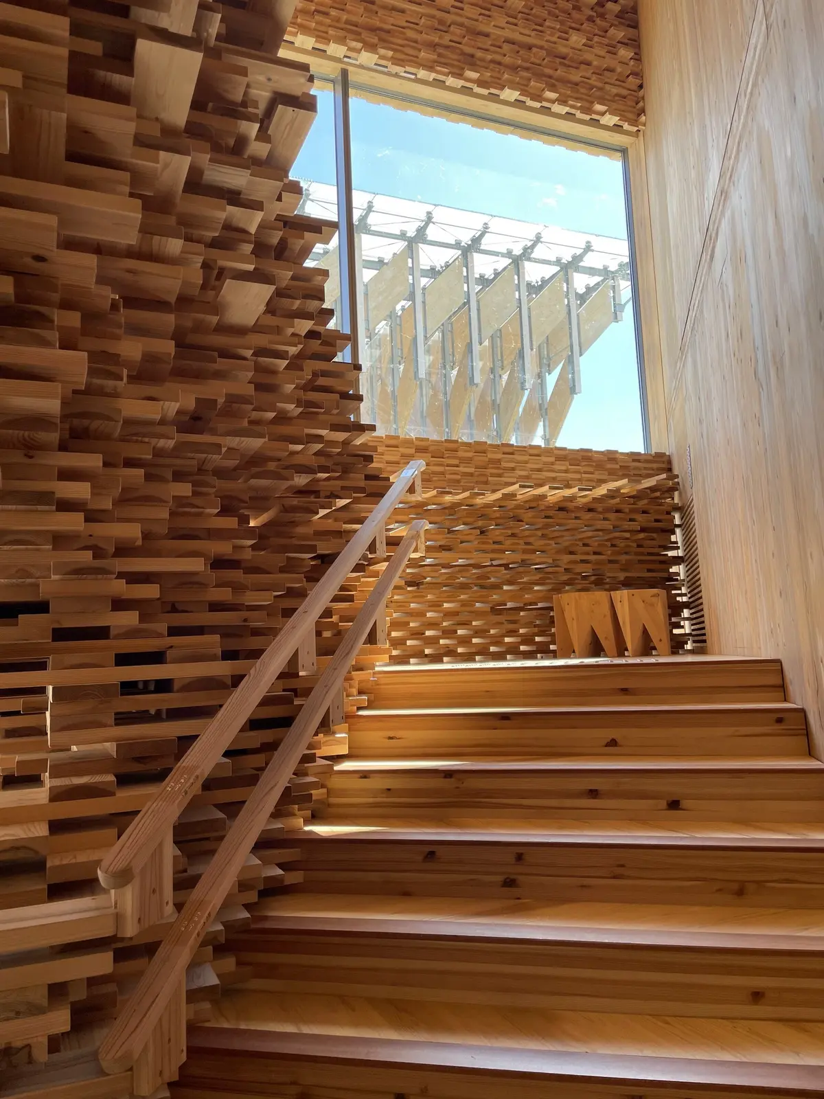 私も上をしばらく見上げたり足を伸ばしたりして、美しい光景と心地よい風を堪能してきました。外でも中でもない、本当にそんな空間でした。風が外にいるように通り抜けていき、日差しは室内のように柔らかでした。隈 研吾氏の世界に触れることができました。