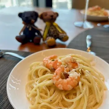 ランチ限定で作りたてを供される小海老 クリーミーレモンスパゲッティも頂き、