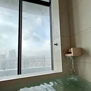 澄んだ冬の青空と、大阪の街並みや水路を望みながら湯船につかり