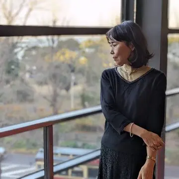 ゴールドのインナーに黒いニットを合わせ、大ぶりのパールの首飾りを添えましたが、なんだかちょっと地味な印象…。