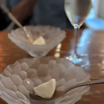スパーリングワインとナポリ産モッツァレラチーズの蜂蜜ソースがけ
