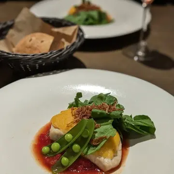 今回のゼルゴバのオードブルも、根菜のようなゴロッとしたお野菜の上にお魚をのせて、葉物を散らす…。