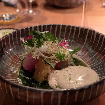 ベイクドビーツサラダ ポン酢 & 豆腐エスプーマ、 サンフラワーシード、松の実