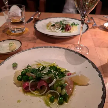 鮮魚のクルード グリーンアスパラガス、新玉ねぎ、グリーンピース、日向夏、グリーンオイル