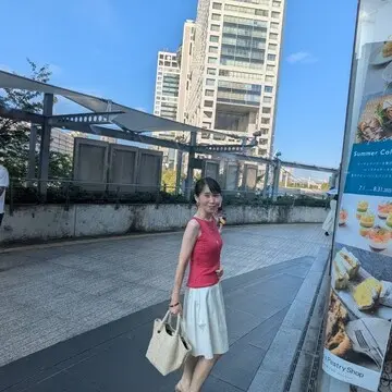 この日のファッションは、真夏の太陽に負けない元気の出る鮮やかな色のノースリーブに、真っ白なスカートを合わせました。