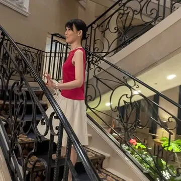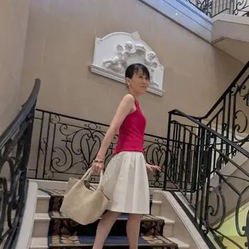 ラズベリーピンク色の鮮やかなノースリーブに真っ白なスカートで