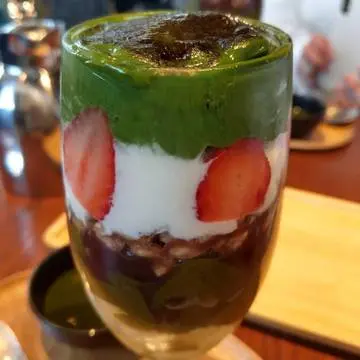 宇治藤井茗縁にて。お目当ての抹茶のブリュレ仕立てパフェ、美味しかった~!