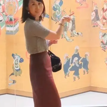 まだ暑さの残る10月半ば。この日は、バーガンディー色の麻のスカートと透かし編みのグレーのニットで。
