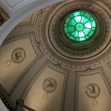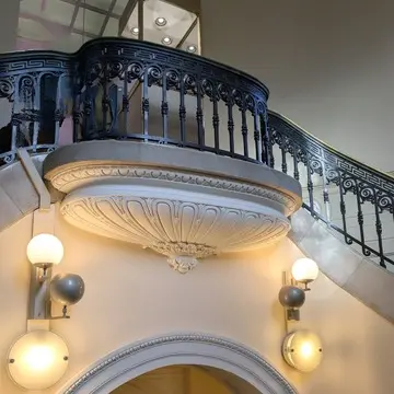 吹き抜けの天井の窓、柱、階段の手すりの装飾…。