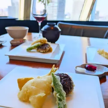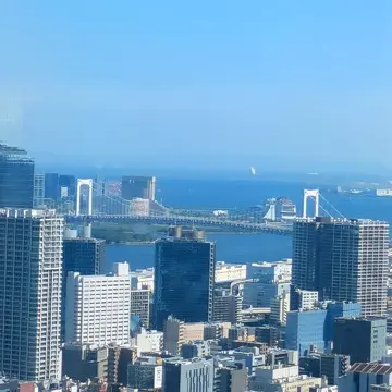 天ぷらのレストランへ行く途中のラウンジからは、東京タワー、都心のビル群、東京湾が臨め、気分爽快!