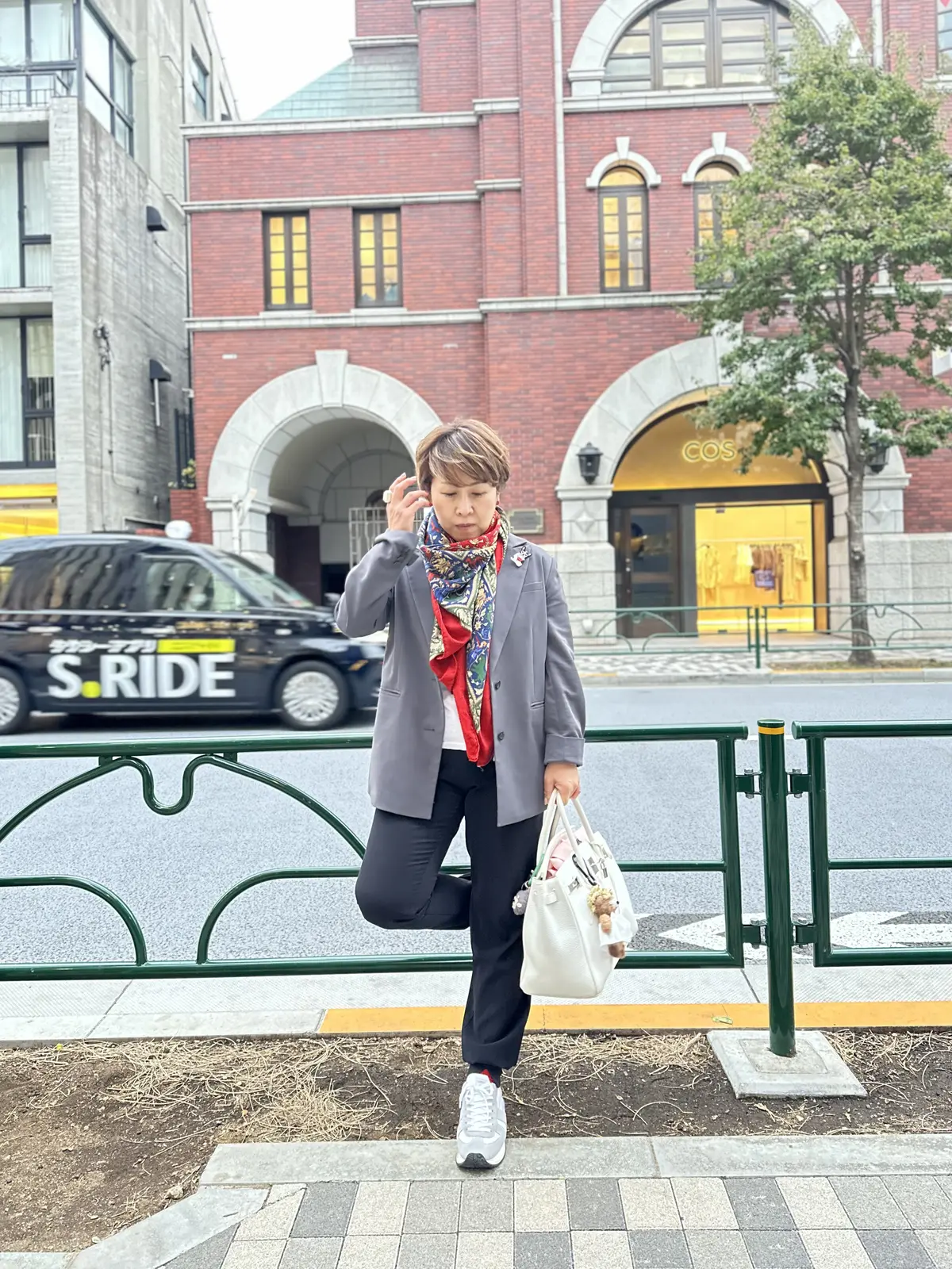 ‥‥とはいえ、絶賛更年期真っ只中の私でも朝晩はまだ冷えるので、首元には母が愛用していたシルクカシミアのHERMESをポイントに。