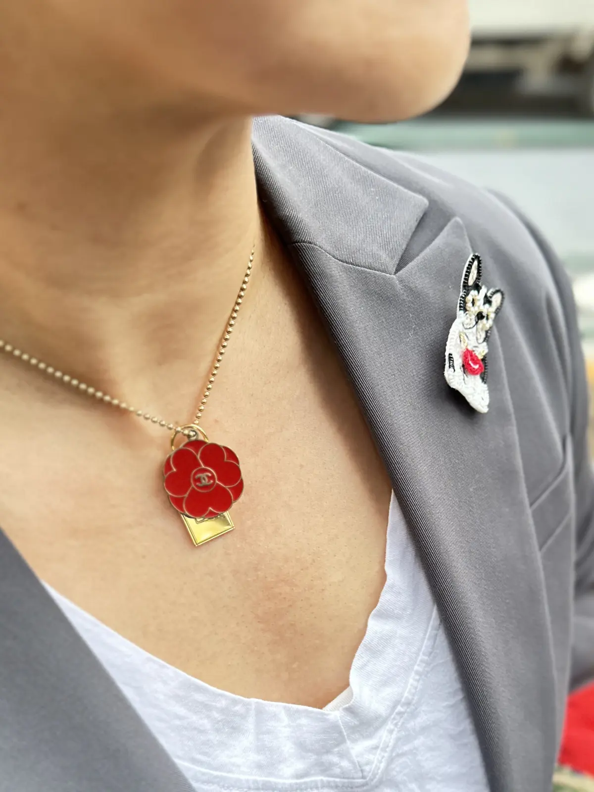 今年のラッキーカラーは「赤」ということで、ネックレスは、CHANELのチャーム&ブローチのフレブルちゃんはRED LIP❤️