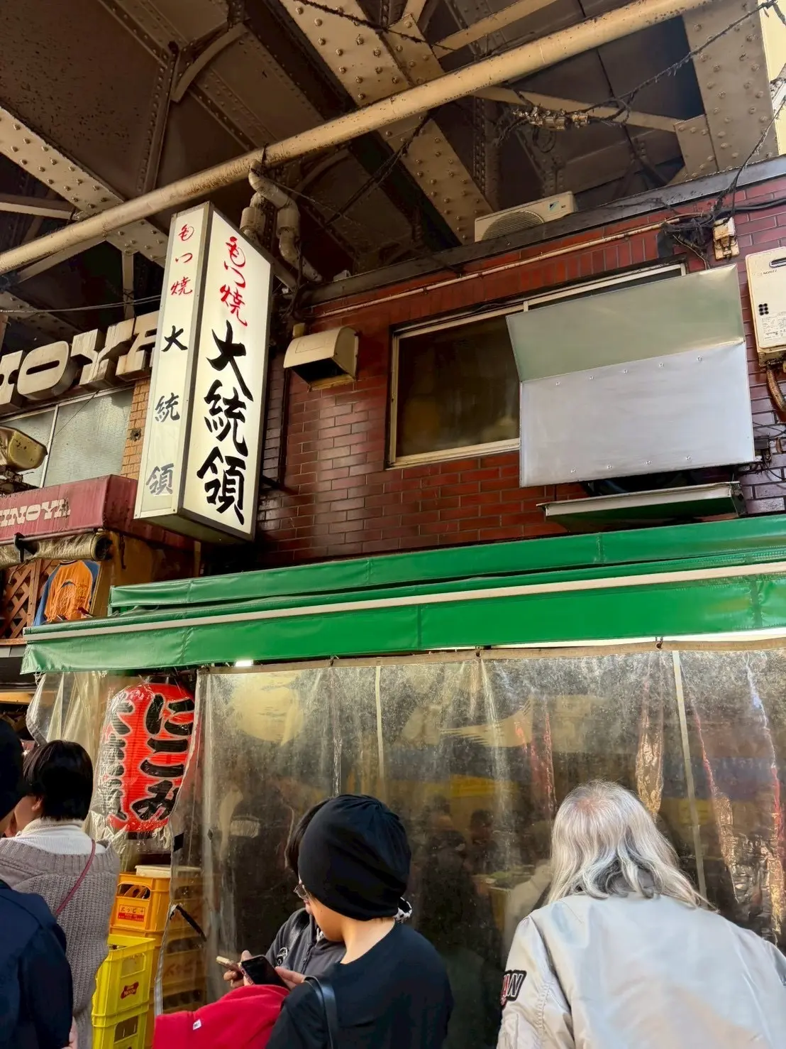 立ち飲みカドクラや肉の大山などなど、寄ってみたいお店はどこもかしこも並んでいたので、こうなったらもつ焼き大統領支店で並ぶことに。