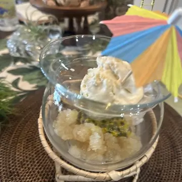 ライチソルベと山椒のアイスは、演出が素敵すぎる!アジアな高台にガラスの器にカラフルなパラソルが⛱️✨