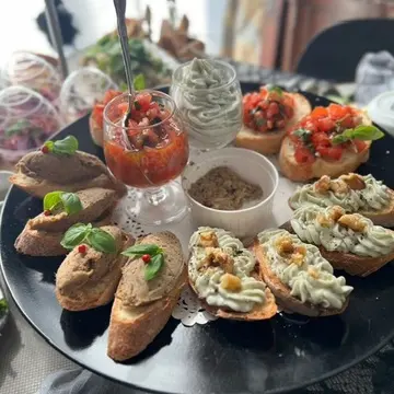 トマトのブルスケッタ ゴルゴンゾーラ、ポークリエット
