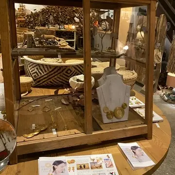 鎌倉の『COLORIDAS』さんの、ブラジル天然植物素材を使用した黄金の草のアクセサリー、メイナク族の壁掛け、動物の置物も参加している、