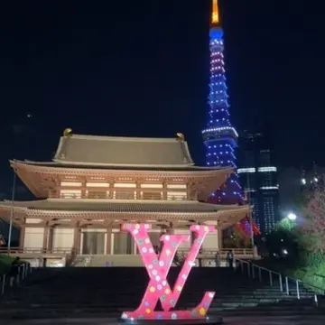 増上寺境内に入ると、人の群れの奥にはカラフルな『LV』スカルプチャーと共に、ドット柄の照明で照らされてます。